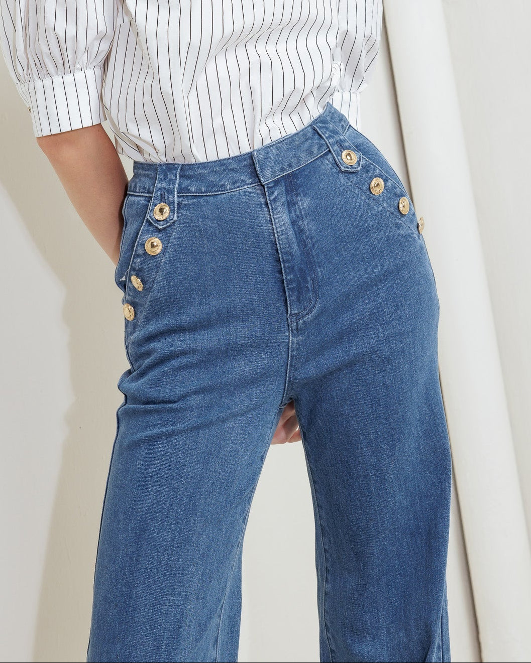 A washed denim pant featuring front closure, side pocket with button detail and wide leg with cuffed hem.