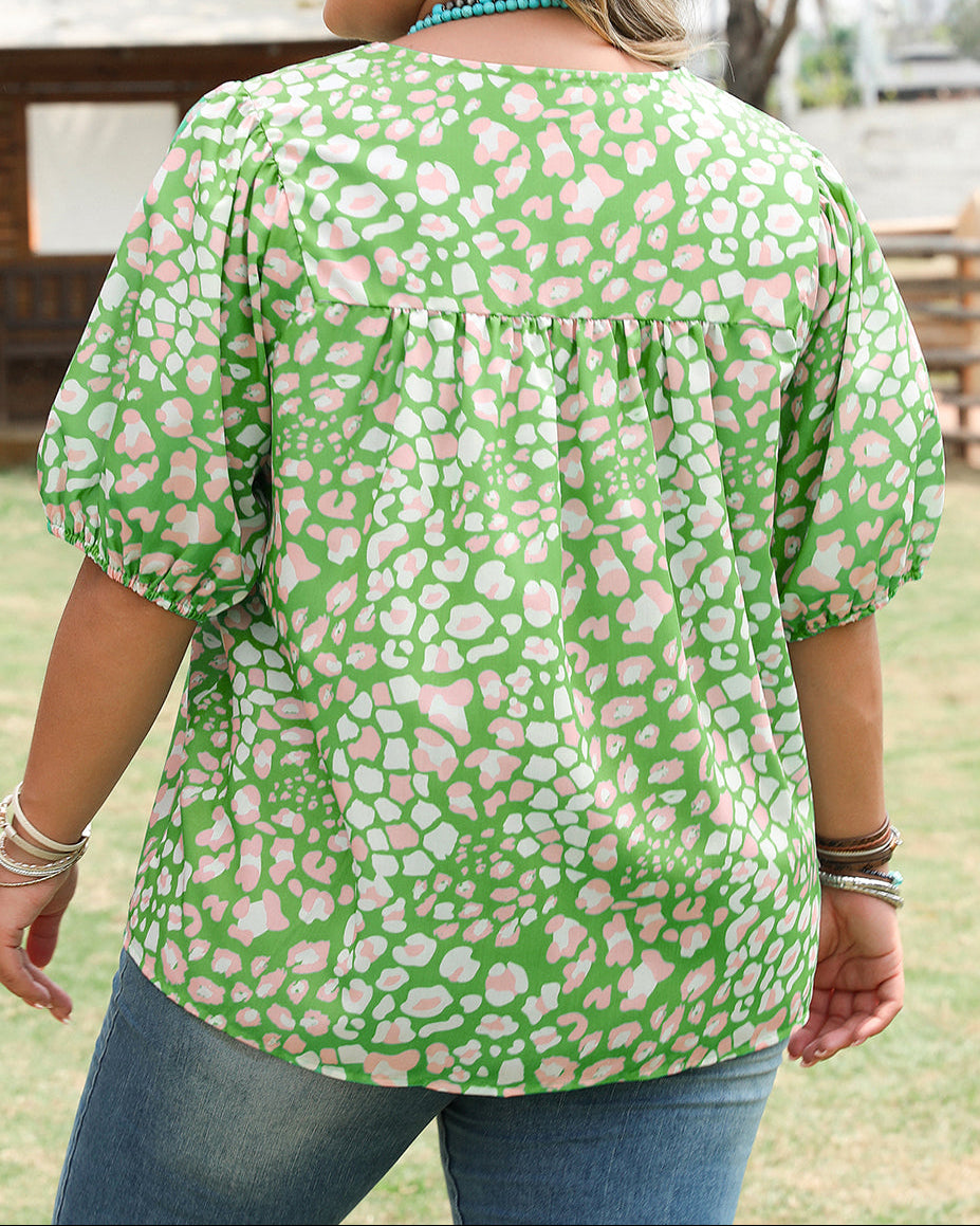 This lively blouse shines in a fresh green shade adorned with a fun floral print. It boasts a stylish split neckline with playful tassel ties and charming puff sleeves that bring a flirty flair. Dress it up with a skirt or keep it casual with jeans for endless outfit possibilities.