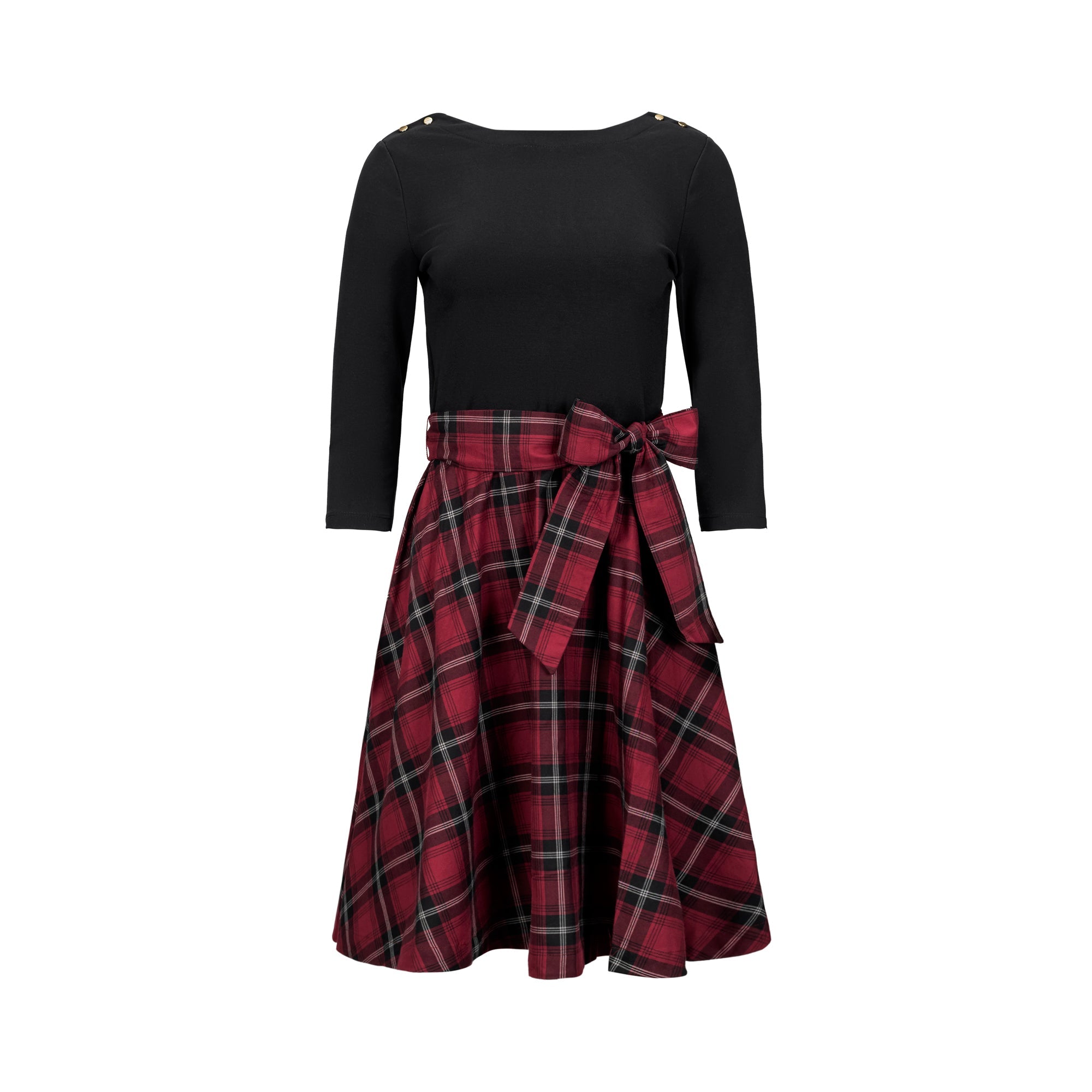 Strike a stunning silhouette in our classic mixed fabrication fit and flare dress with waist sash. Features a bodice cut from our substantial and soft organic cotton blend ponte knit paired with a woven skirt and sash. Center zipper down the back for easy dressing and gold buttons at the shoulders for just the right amount of shine. A dress for all occasions!