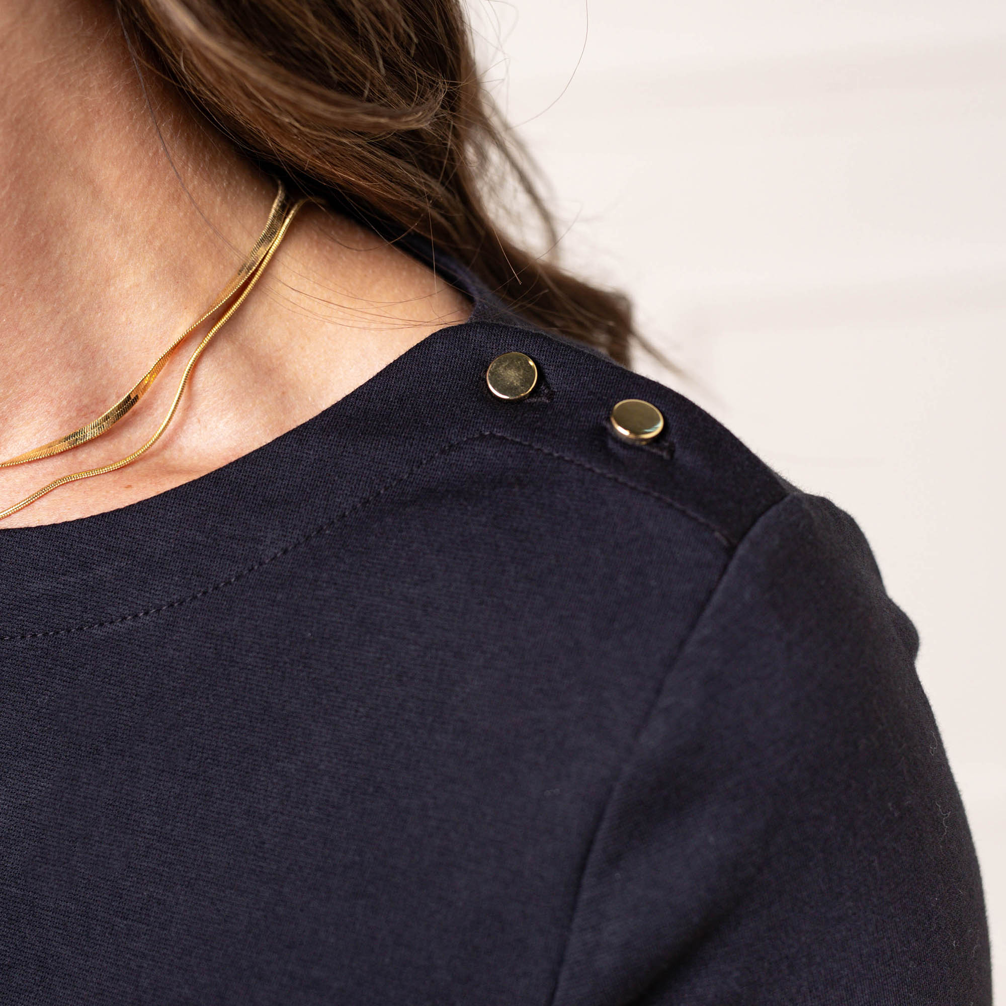 - Gold buttons at the shoulders and hidden zipper down the center back. Machine washable.