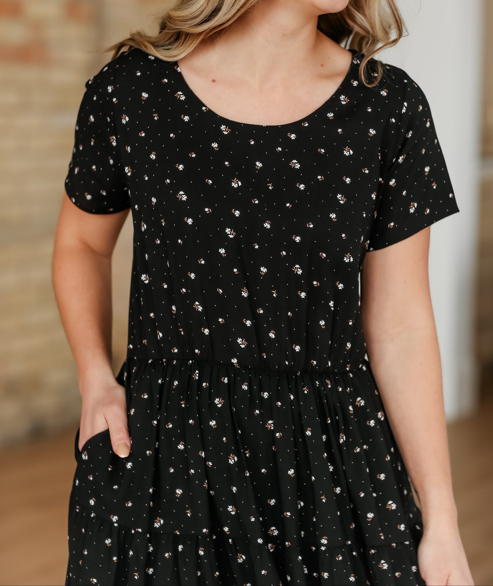 The Jenna Floral Knit Midi Dress blends effortless style and comfort for a year round dress. Made in the USA from soft, stretchy knit fabric, it features a modest round neckline, short sleeves, and an elastic waist for a flattering fit. The tiered skirt adds feminine flow, making it perfect for everyday wear. Pair this floral midi dress with sneakers or flats for an easy, polished look.