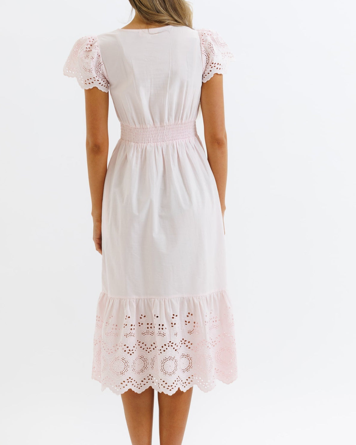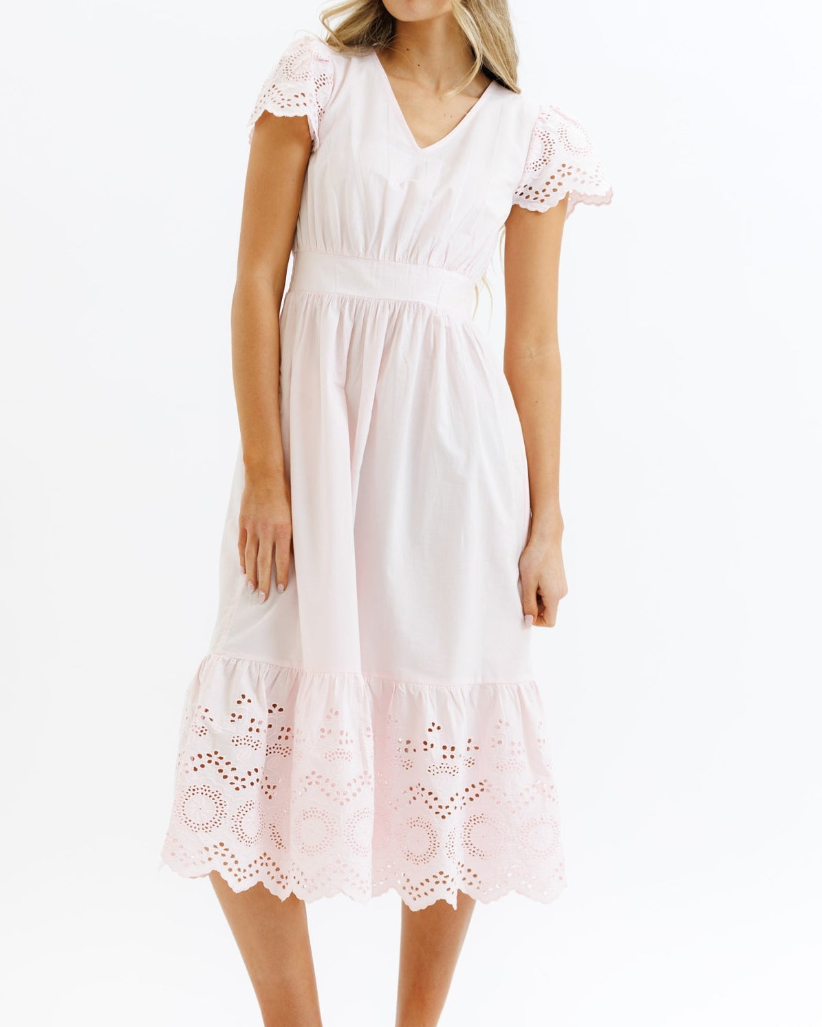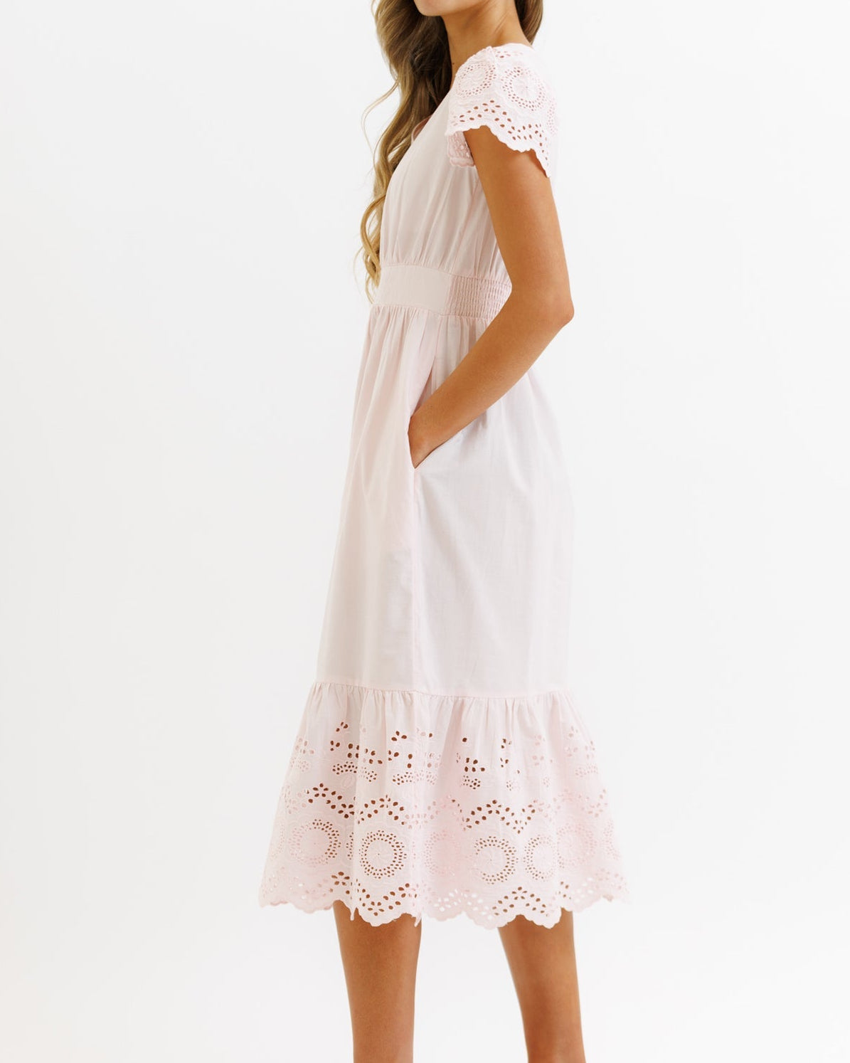 An A-line dress with a midi length skirt that has eyelet detailing at the hem. Features a v-neckline, short flutter sleeves with eyelet detailing, smocked back waistband, and side seam pockets