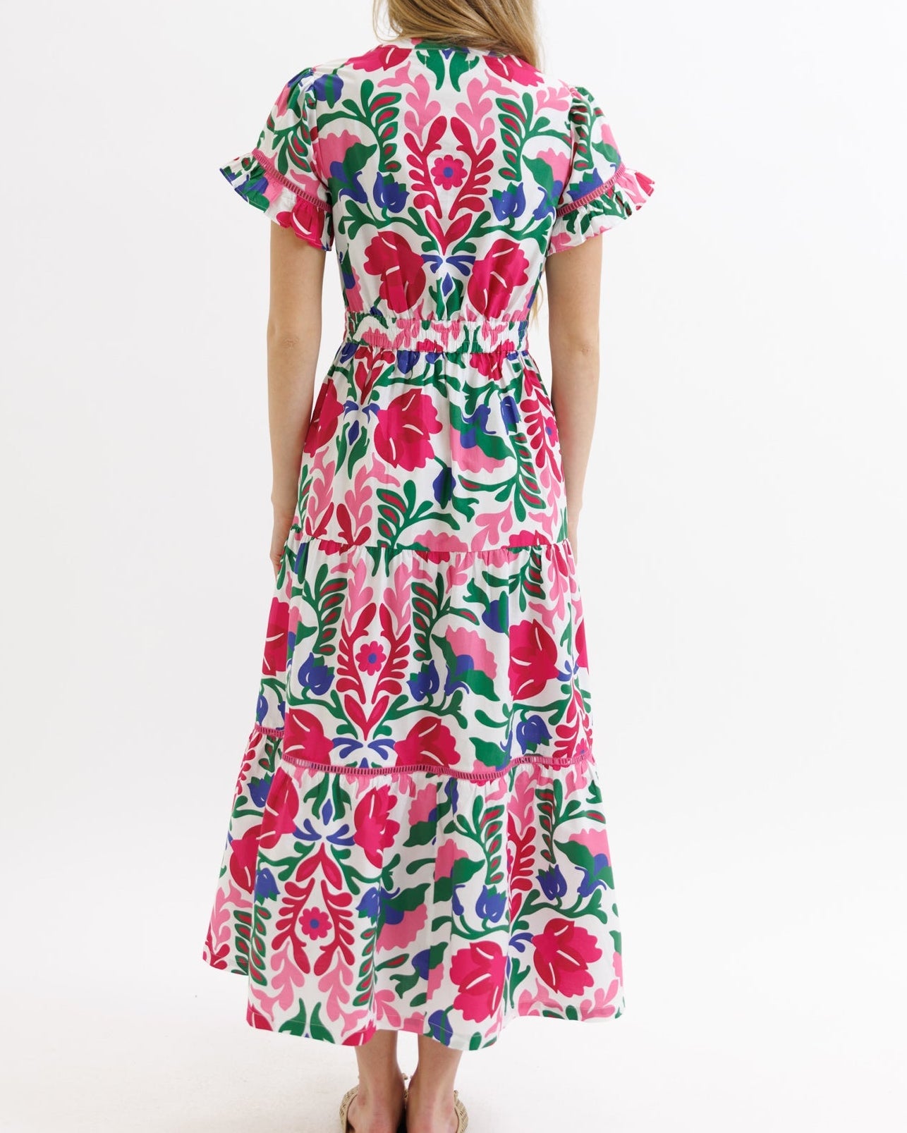 A maxi tiered A-line dress with a V-neckline, short sleeves with ruffles, button down bodice, and side seam pockets.