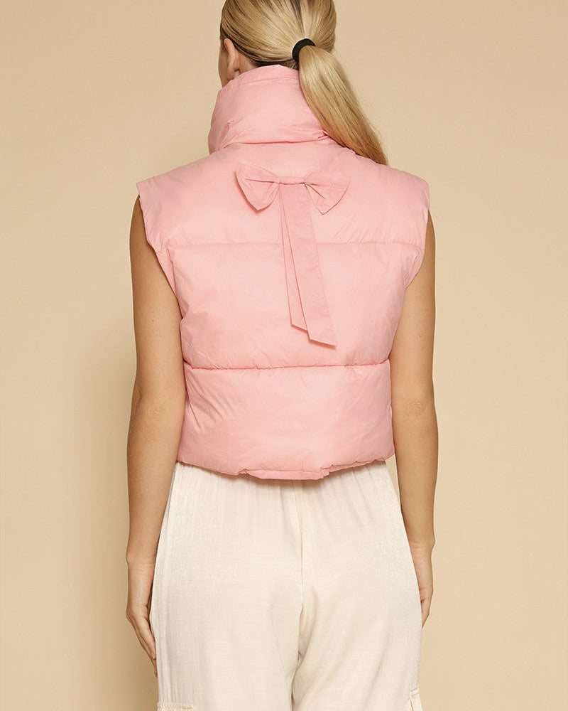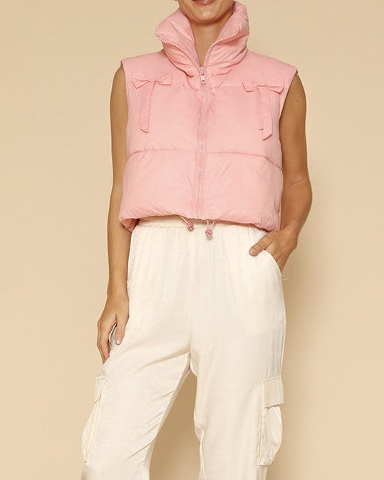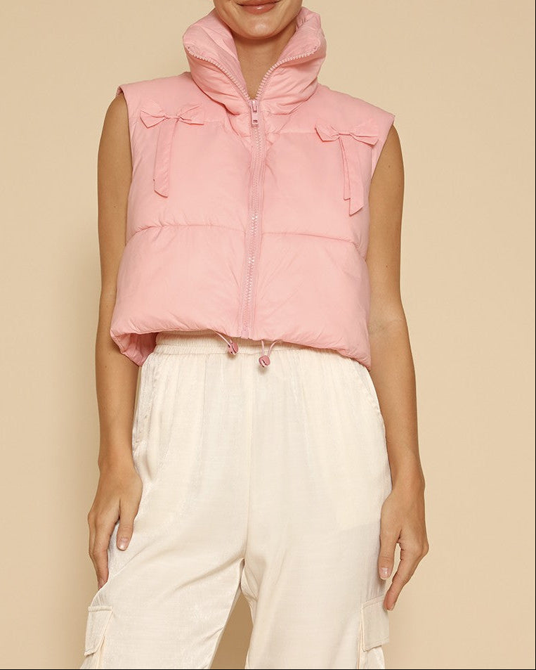 This adorable cropped puffer vest has bow detailing on the front and back with a zipper front closure.