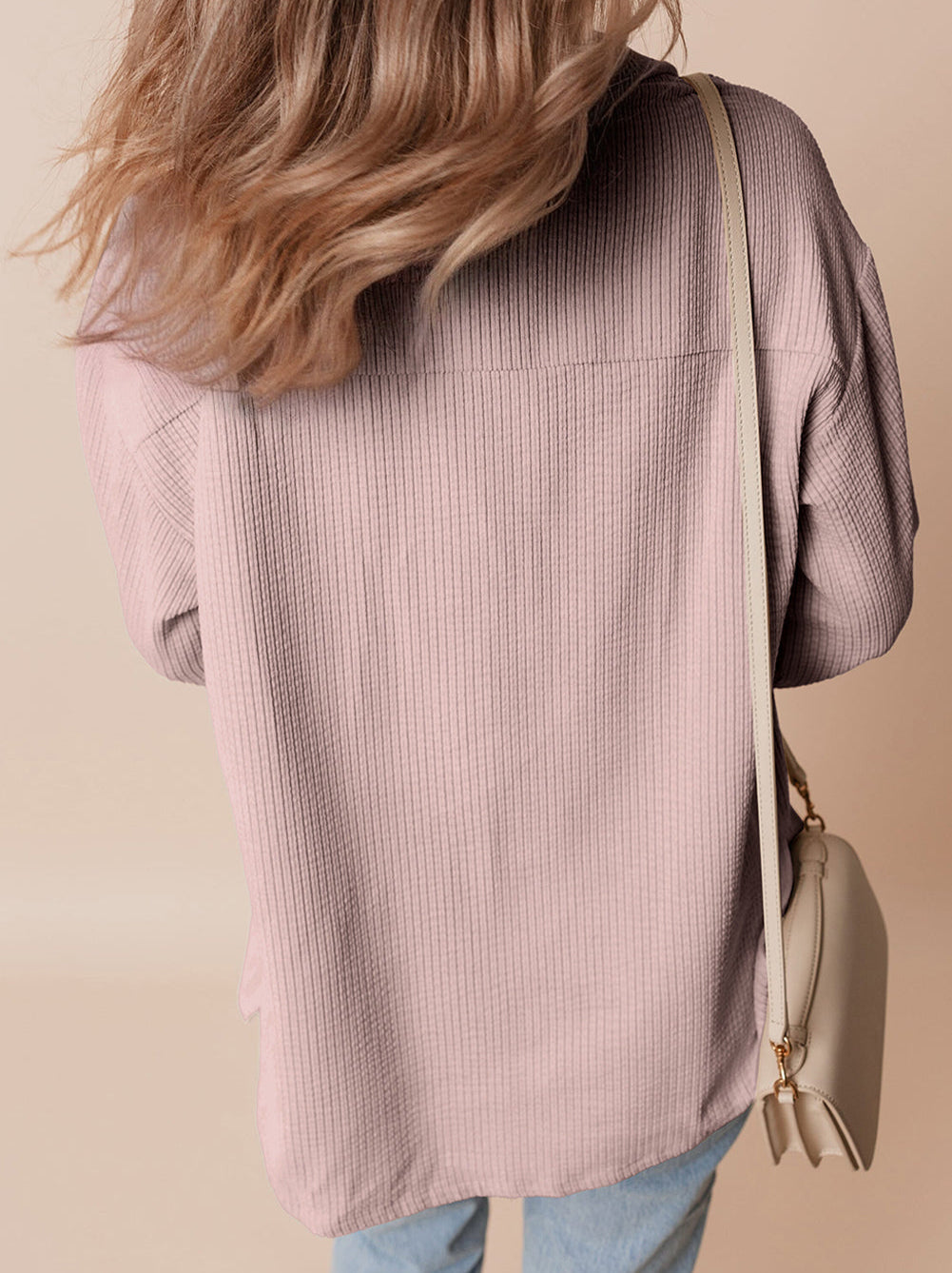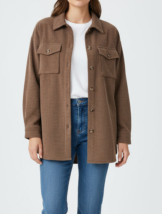 This corduroy shacket is perfect for a cozy and stylish feel. Functional flap pockets for added convenience and style. Button-up closure for a classic and versatile look.