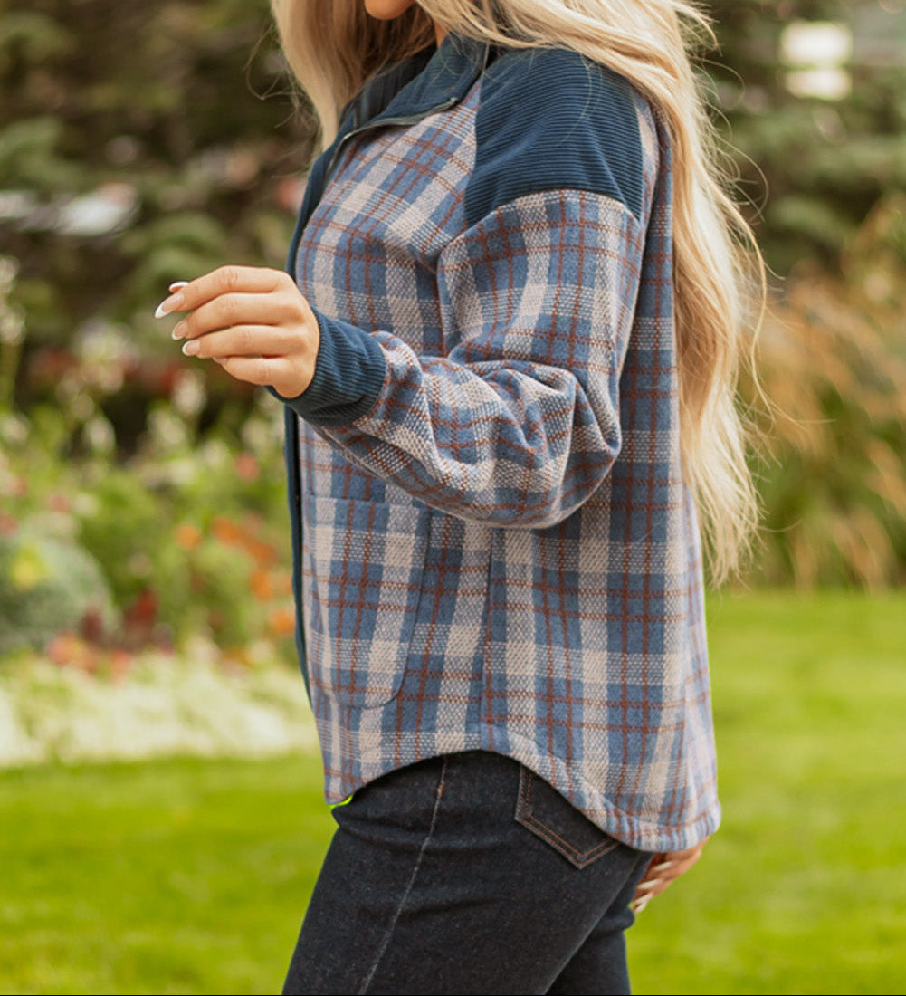 Plaid corduroy patchwork adds retro charm and unique texture. Collared neckline offers classic structure and layering ease. Zip up and snap button closure for warmth and convenience. Relaxed fit makes it perfect for casual fall and winter looks.