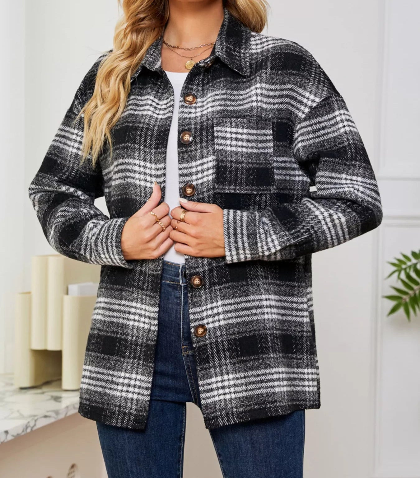 This plaid shacket comes with button closures and handy pockets. It has a regular thickness and an unlined body. Perfect for adding a cozy, fun layer to your outfit!