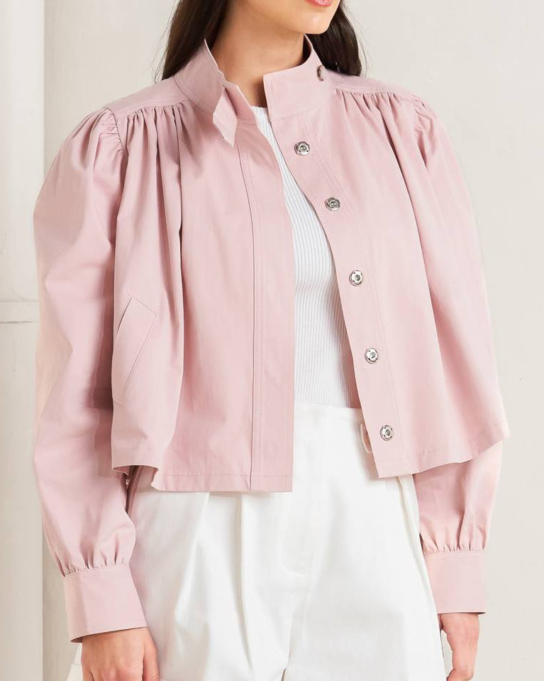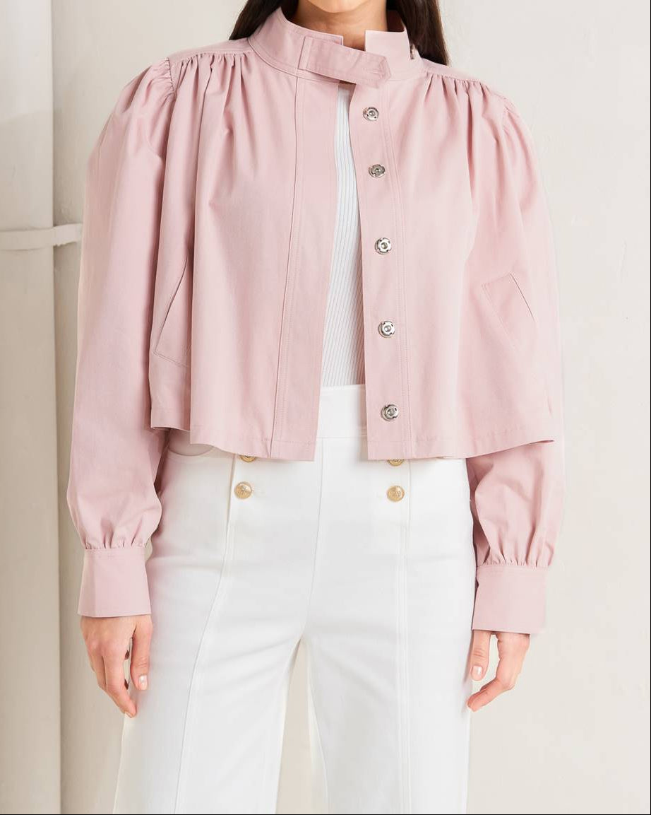 A solid woven jacket featuring high neckline with button, shirred shoulder, long puff sleeve with cuff and hidden button closure