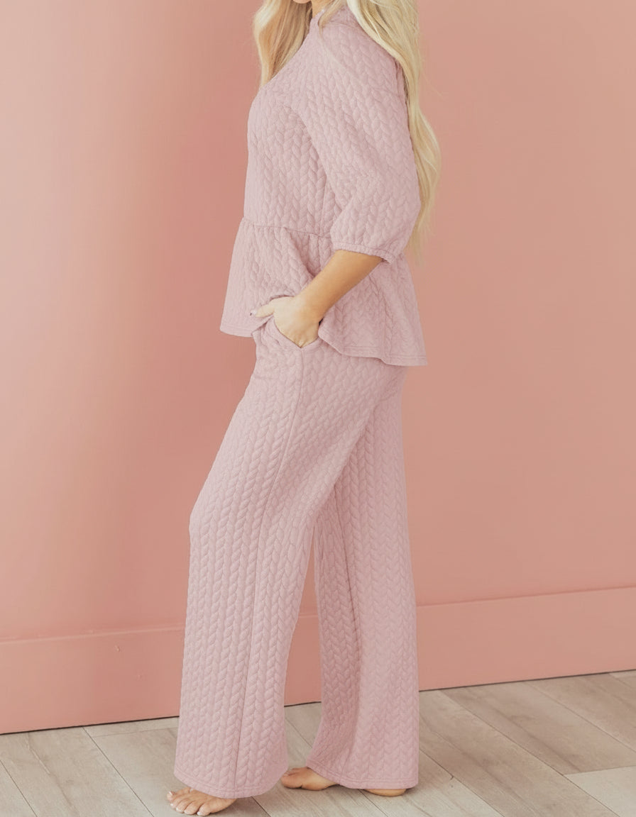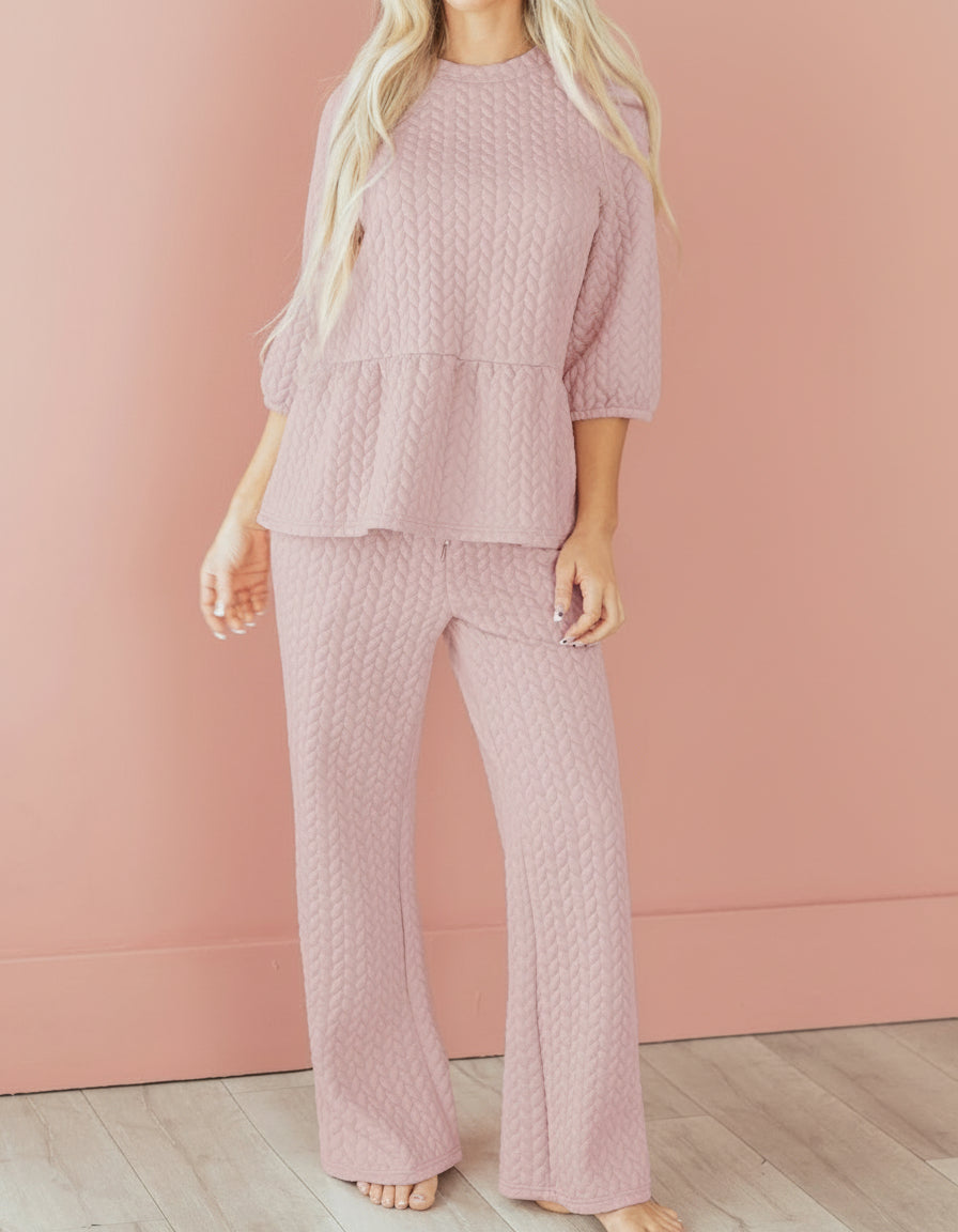 This braided texture pants set is sure to give an impressive look. The braided texture and playful wide leg cut bring all the stylish vibes you'll adore. The ruffled hem gives this casual outfit an adorable vibe. An elastic waistband with a functional drawstring, functional side pockets and wide leg style. 3/4 sleeve with elastic cuff.