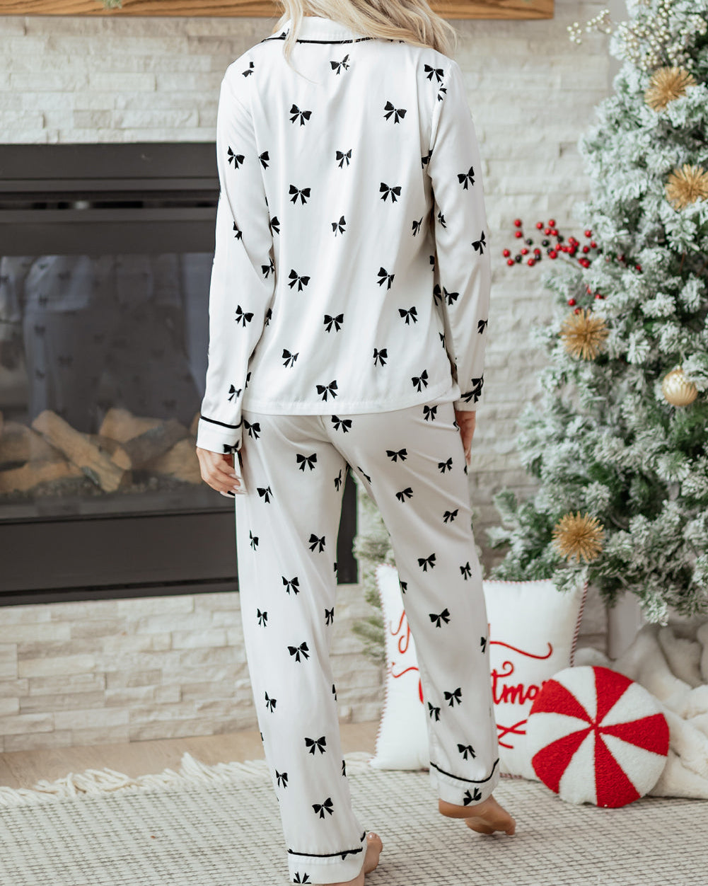 Adorable bow print design adds a charming touch. Buttoned top for easy wearing and removal. Lace-up waistband allows for a customizable fit. Soft and comfortable fabric for a cozy night's sleep.