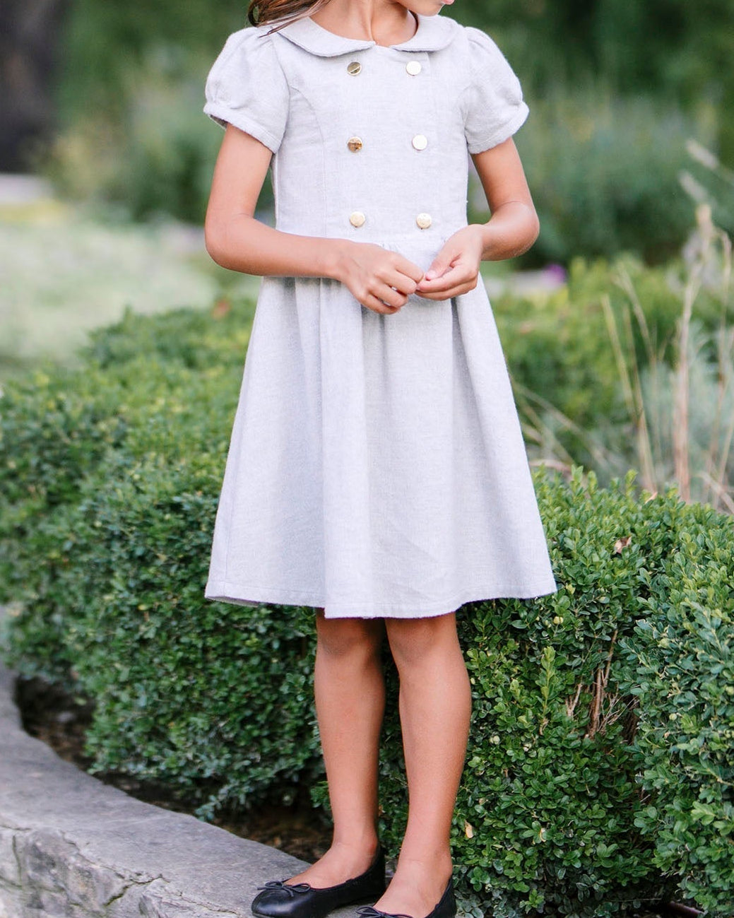 Made in soft and chic organic cotton flannel and featuring a classic silhouette, this pretty dress is made for picture time. Features flattering puff sleeves, a peter pan collar, and a double breasted button front (with one column of functional buttons for ease of dressing). A beautiful piece paired with tights that can carry her through the fall and winter season.