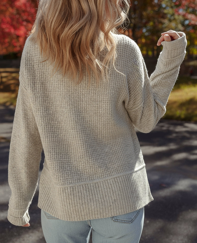 We love this chic sweater not only for its waffle texture but also fine quality. This women's sweater is ultra-soft, warm, and provides great comfort. It’s versatile and loose fit for most body shapes. The high neck gives an elegant yet warm look.