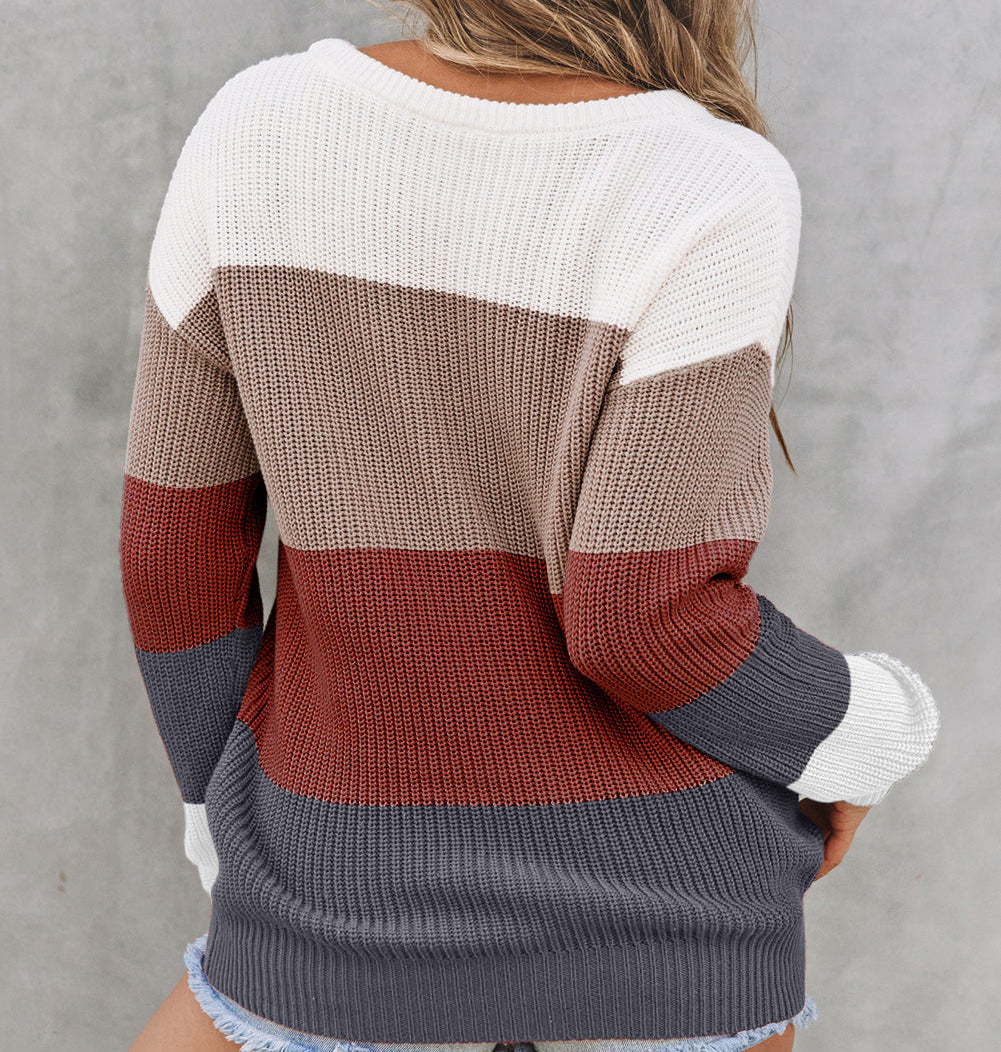 This neutral sweater is fashionable with color block stripes construction. Crew neck, long sleeves and comfy fit style for most. This sweater is soft and warm for those fall days.