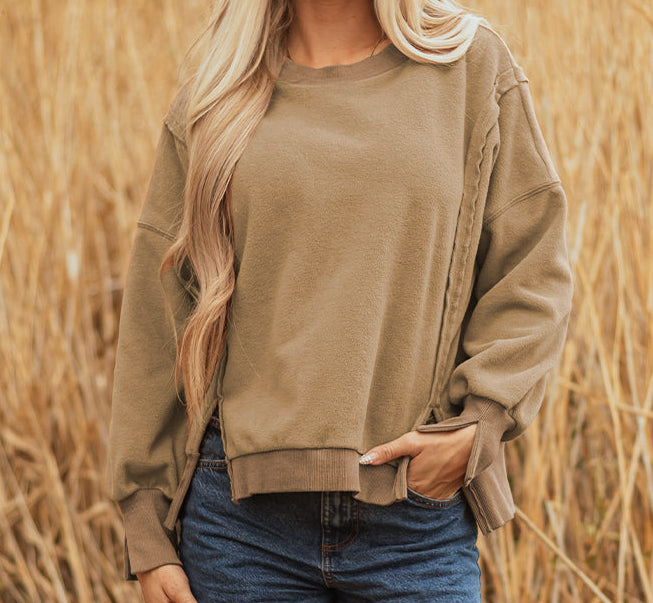 Sink into the ultra-cozy warmth of fuzzy sherpa fabric—perfect for those crisp, chilly moments. The splicing design adds a fun twist with contrasting textures you'll love to touch. Side slit hems let you move freely while keeping a flattering silhouette. This pullover is your go-to for playful, easy layering on laid-back days.