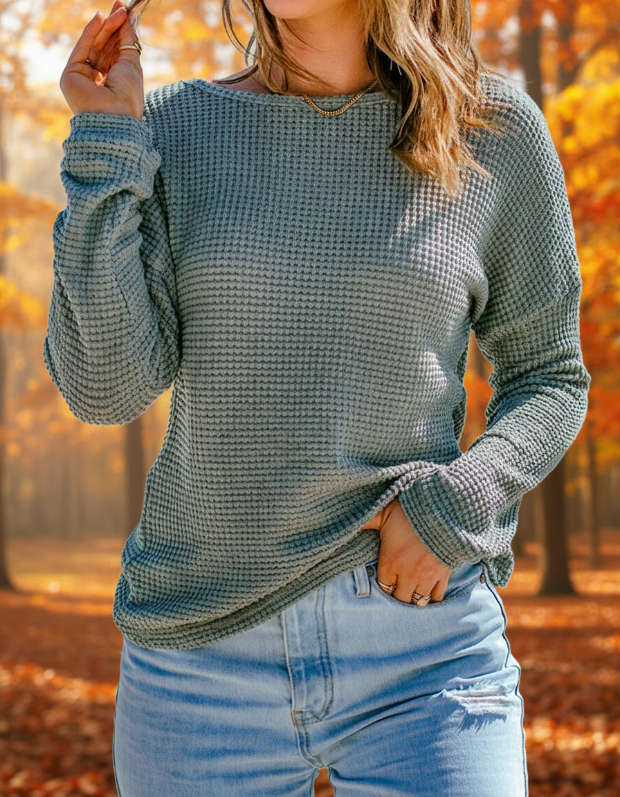This chic long sleeve top is very comfy due to the waffle knit texture. The drop shoulder design gives this knit top a slouchy feel. Pairs great with jeans, joggers, or your favorite lounge pants.