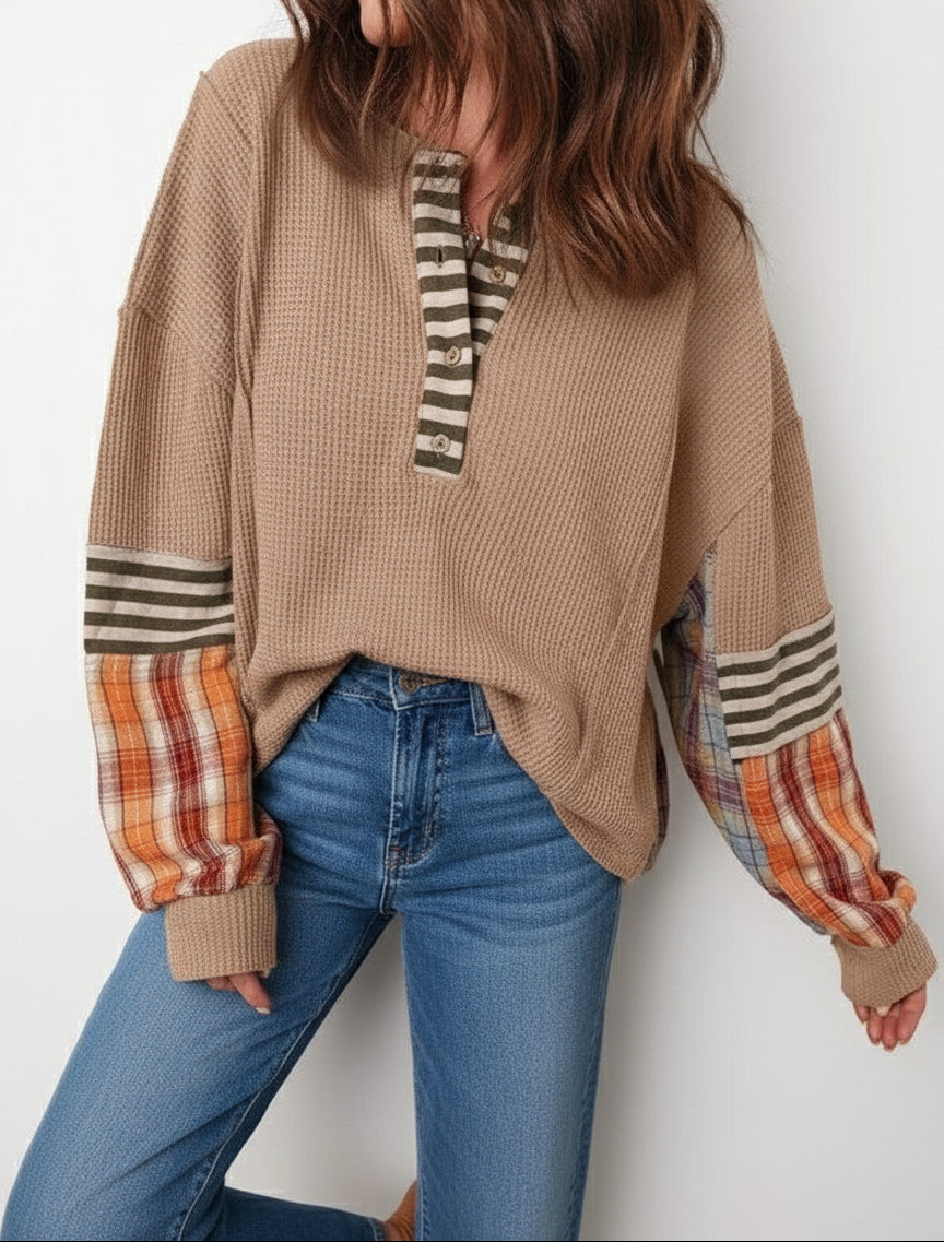 Effortlessly blend casual and chic with this top, combining a unique mix of patterns for a unique, standout look.