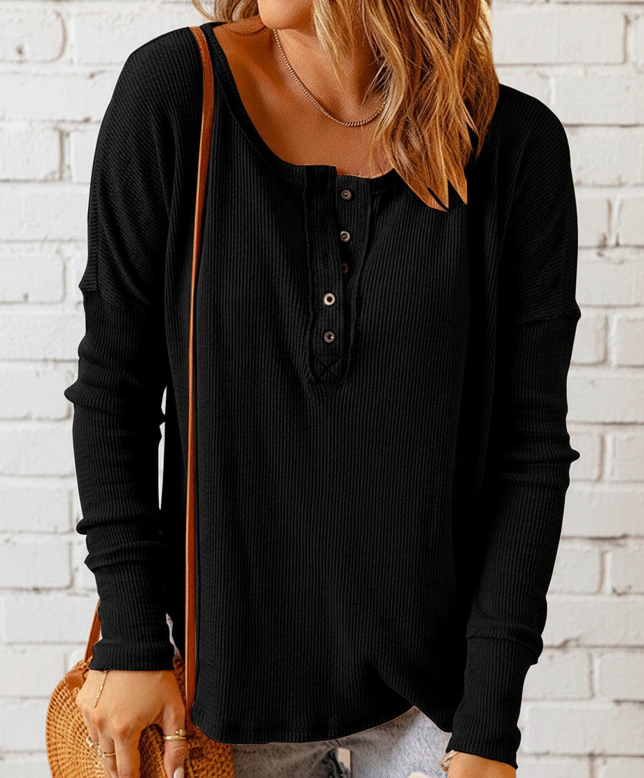 The Harper Waffle Knit Henley Top is effortless, flattering, and easy to style. The waffle knit texture makes this long sleeve top comfy and casual. Features a round neck, front buttons, and long sleeve.
