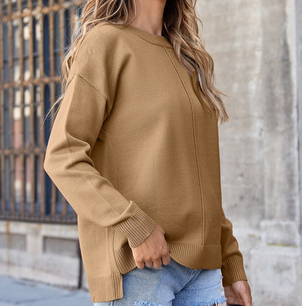 This solid sweater for women is concise and versatile. It’s relaxed fit with drop shoulder design. The front center seam adds chic detail to this knit pullover. It matches well with any chic bottoms for trendy seasonal look.