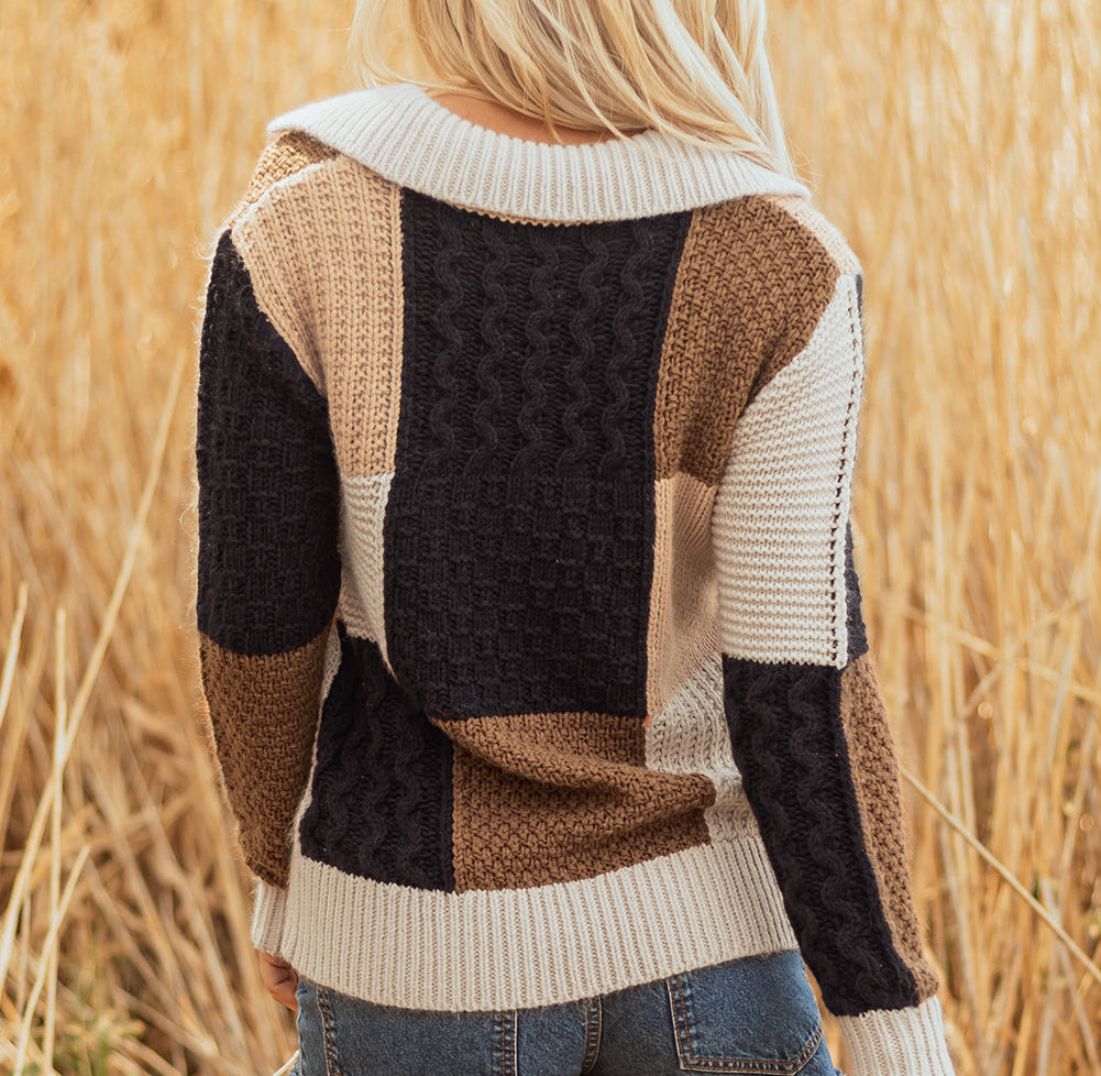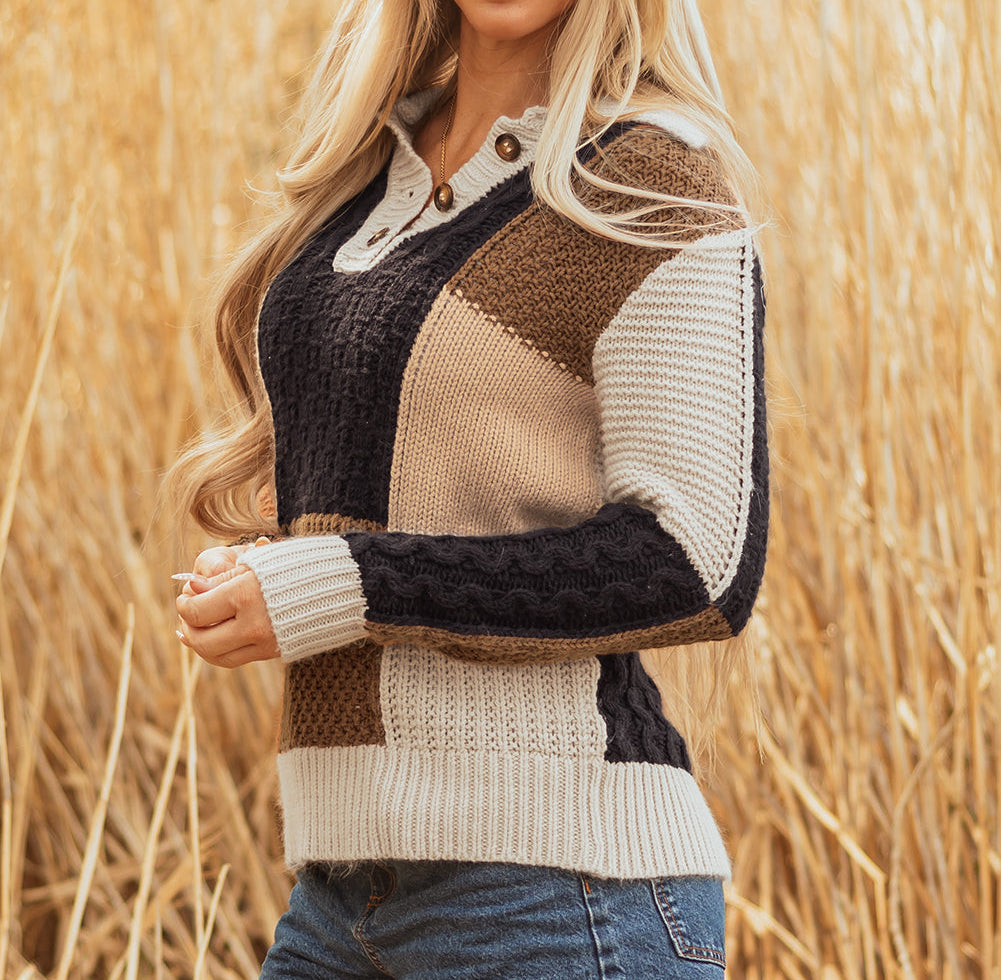 This cozy knit sweater stands out with a playful color block design that pops! The cable knit sleeves bring fun texture and a cozy, seasonal charm. Button details and a crisp collar add a cute, preppy twist. Snuggle up in soft fabric that keeps you warm and comfy all day long.