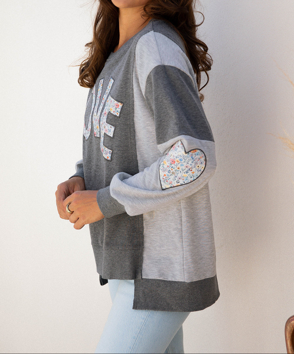 Bold LOVE graphic sweatshirt adds charm to any casual look. Exposed seam detail and patchwork give it a trendy, edgy fashion-forward touch. Uneven hem design creates a modern silhouette that flatters all body types. Cozy fabric blend keeps you warm and stylish.
