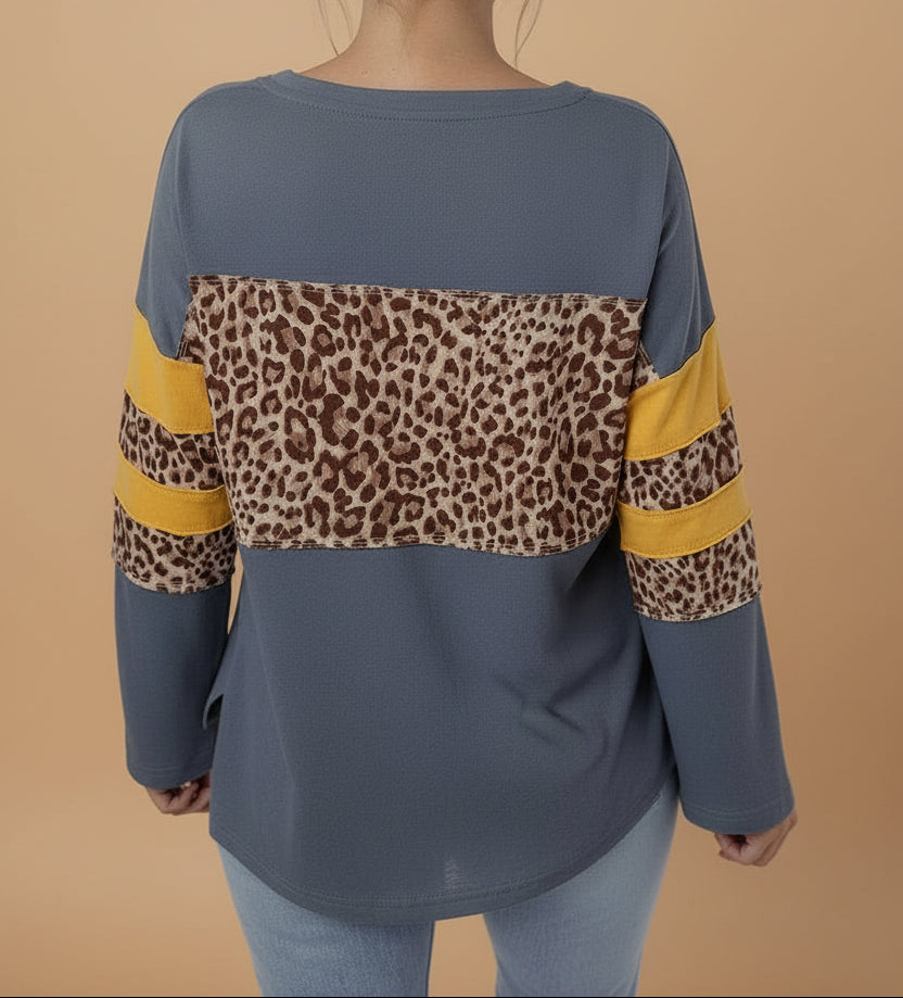 A dark blue relaxed long sleeve top with yellow and leopard color block accents. A casual sporty feel to it. Perfect for a fun casual hangout.
