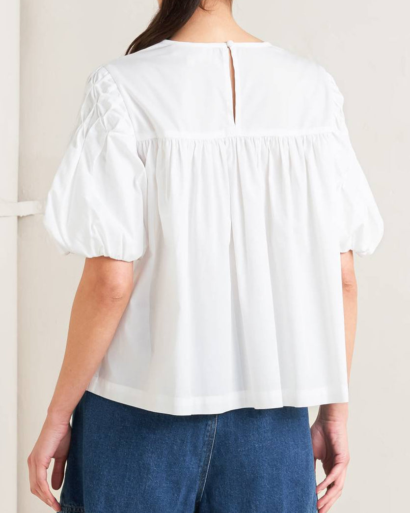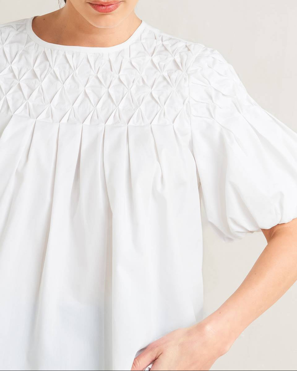 A solid woven top featuring round neckline, honeycomb yoke, short bubble sleeve and back neck button closure